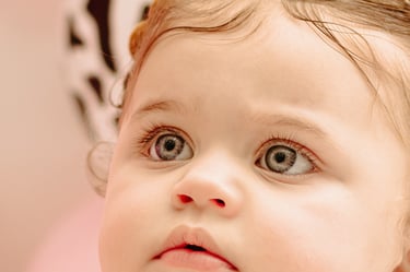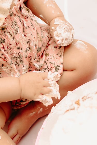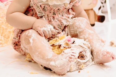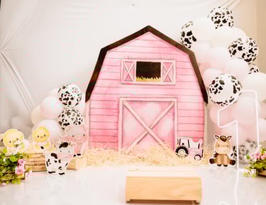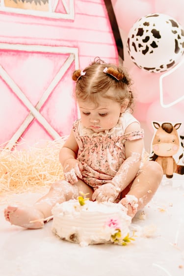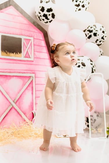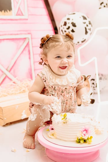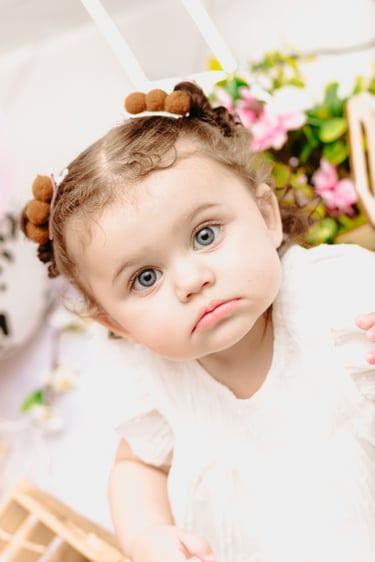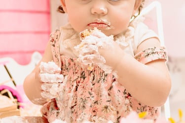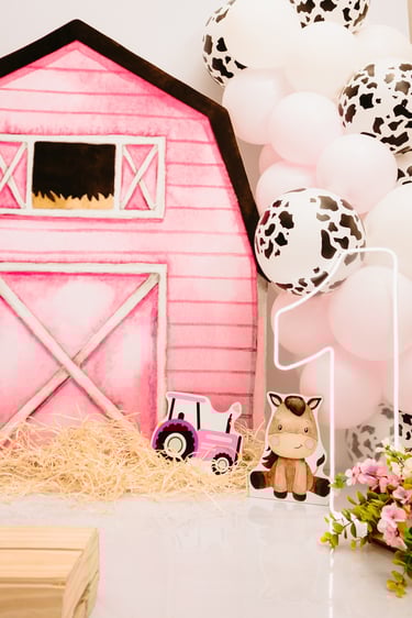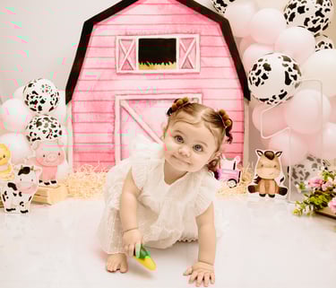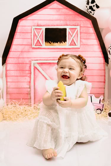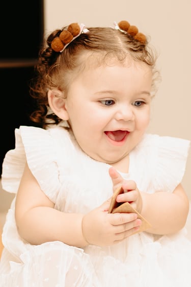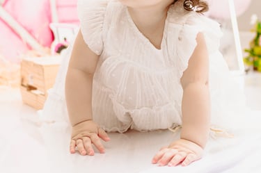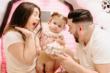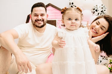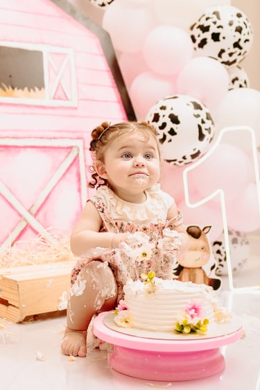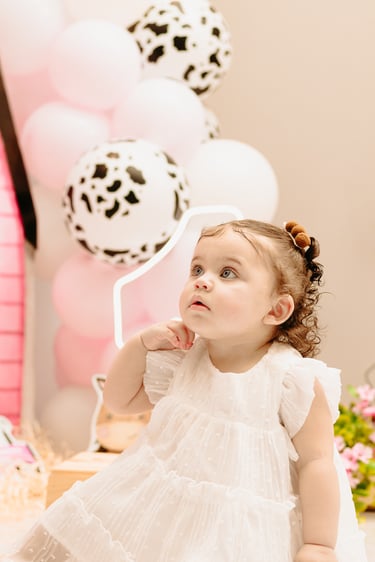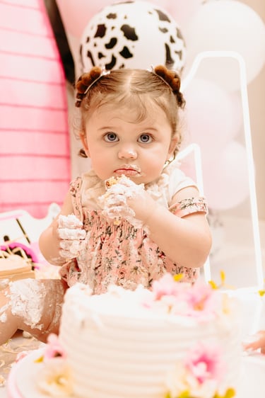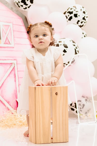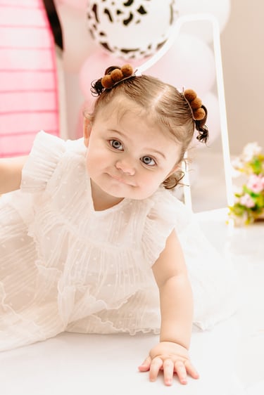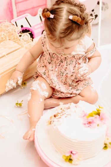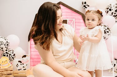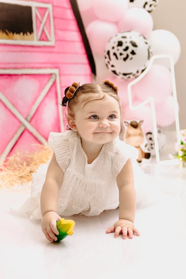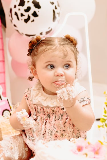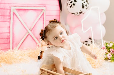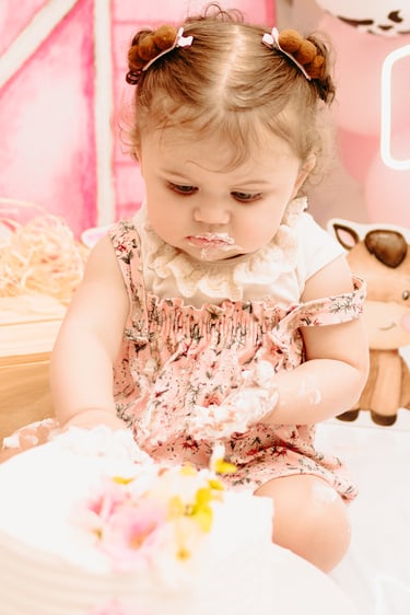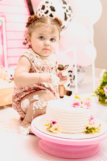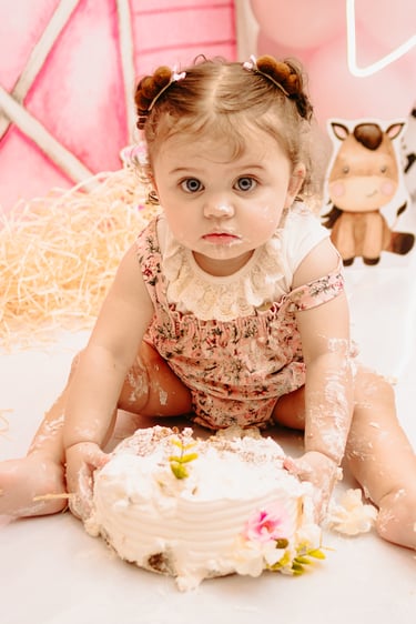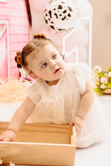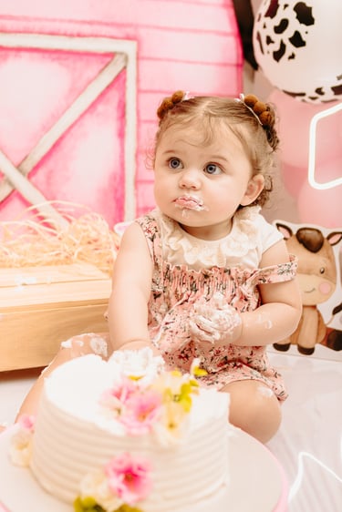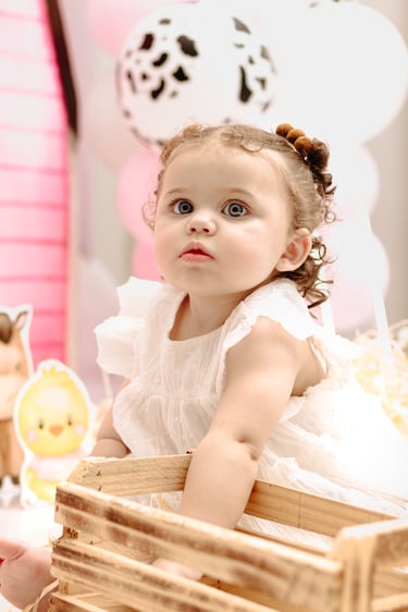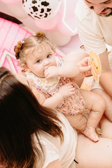 O ensaio da Maria Alice foi feito a domícilio no conforto do seu lar com a sua família e a decoração personalizada foi baseada na decoração da festa e do convite, usamos os mesmos elementos e mesmas cores