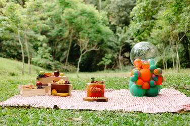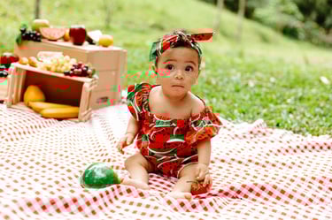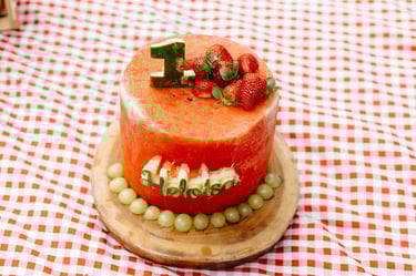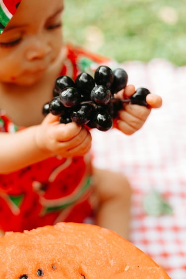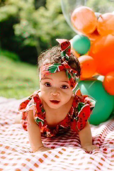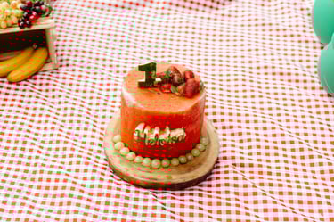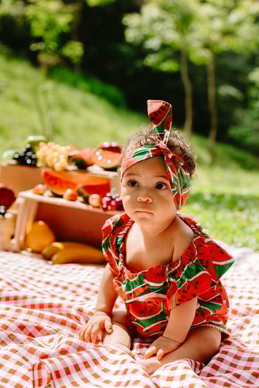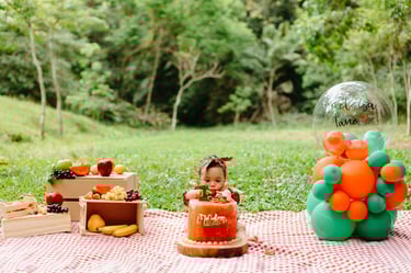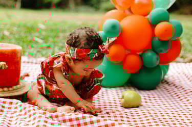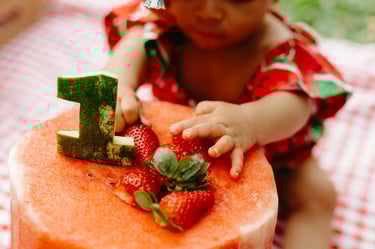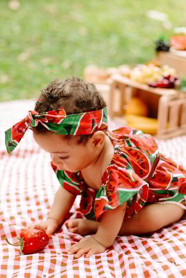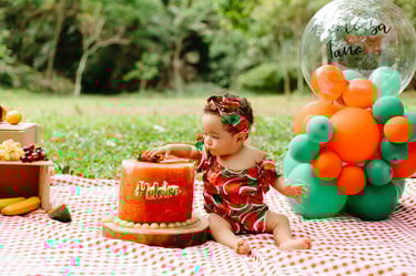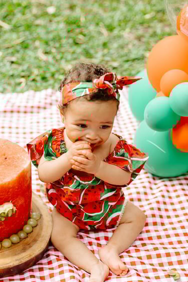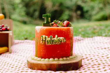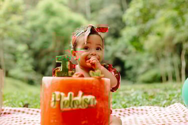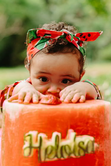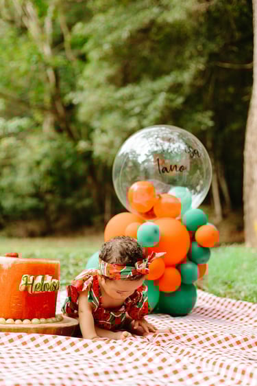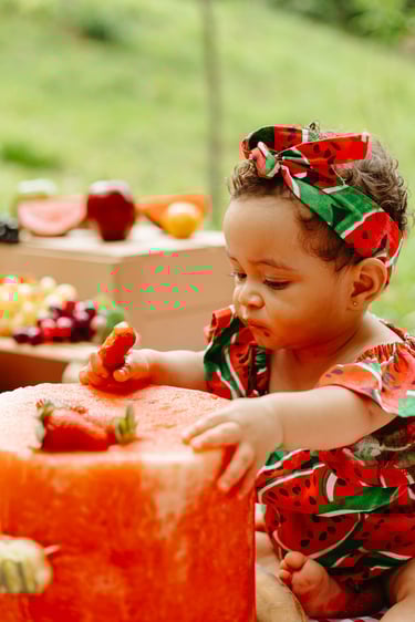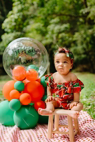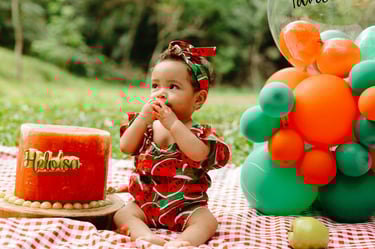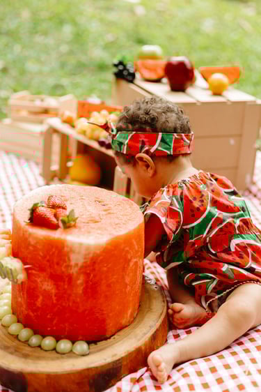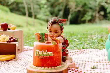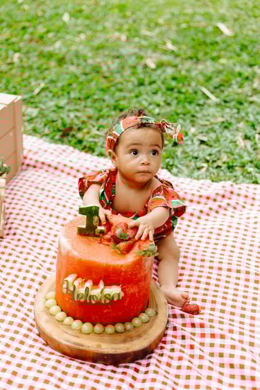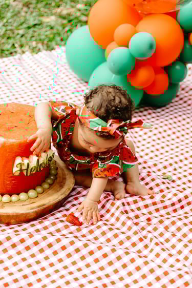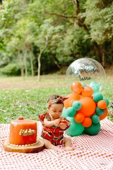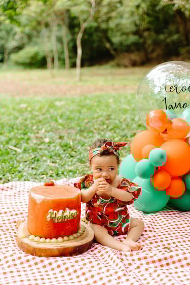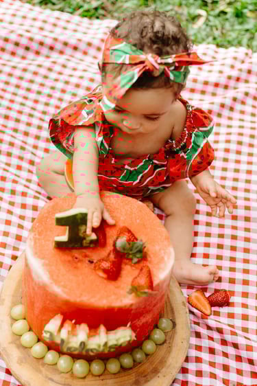 O ensaio da Heloísa foi feito ao ar livre, com o tema de melancia. Livre de açucar, corante e nutritivo, claro que o bolo não poderia ser outra coisa...
